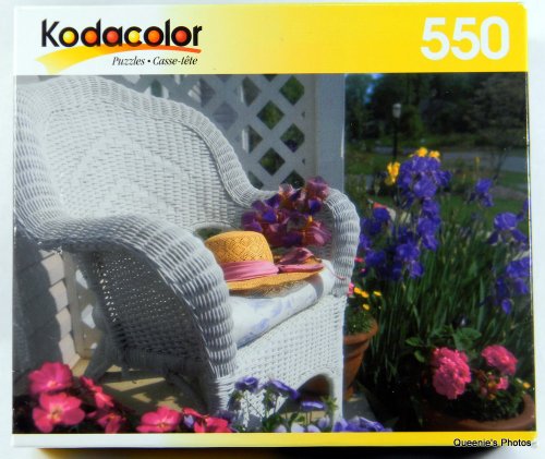 Morning Still Life Kodacolor 550 piece jigsaw puzzle my RoseArt. Item 20550. Measures 13 x 19" when completed. Image features a white wicker chair, straw hat and flowers.